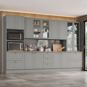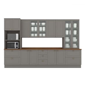 O(a) Cozinha Completa Americana 13 Portas 7 Gavetas com Vidro 100% Mdf Cinza/Natural - Henn é produzido em 100% MDF na escala de brilho Fosco, e possui um grau de dificuldade de montagem: Médio.