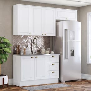 Cozinha Completa Americana 3 Peças Branco - Móveis Henn Branco Cozinha Completa Americana 3 Peças - Móveis Henn Com design contemporâneo, a Cozinha Americana embeleza qualquer ambiente. Seu conceito é inspirado nas clássicas cozinhas estilo americano, oferecendo uma decoração moderna e minimalista. Ela conta com puxadores em metal zamac, dobradiças 35mm com amortecimento e espaçosos aéreos com 83cm de altura, proporcionando praticidade e funcionalidade. É um armário de cozinha 100% MDF com mais de 15 módulos, que possibilitam criar o projeto de cozinha dos seus sonhos. ESPECIFICAÇÕES: - Estrutura 100% MDF - Pintura UV - 6 Portas, sendo 1 basculante - 3 Gavetas - Dobradiças de 35mm com amortecimento - Corrediças telescópicas - Puxadores em zamac ouro velho - Tampos em MDP/BP - Opção de instalação sem rodapés, suspensa - Balcão Pia não acompanha cuba e tampo