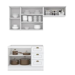 O ambiente é composto por (L x A x P): 1x C352-05 Aéreo 3 Portas 120cm: 120 x 83 x 32,5 cm 1x C354-05 Aéreo com Porta basculante: 80 x 34 x 32,5 cm 1x C353-05 Balcão Pia 3 Gavetas e 2 Portas: 120 x 82 x 51 cm (Não acompanha cuba e tampo)