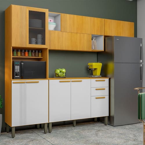Transforme sua cozinha em um ambiente de requinte e funcionalidade com a Cozinha Completa Anne, onde cada peça é cuidadosamente projetada para agregar estilo e praticidade ao seu espaço. A cozinha é composta pelo Balcão Anne, que apresenta 3 portas, 2 gavetas com corrediças telescópicas e divisor de talheres, além de pés com regulagem de altura. Sua estrutura é complementada por puxadores em MDF, proporcionando um toque de elegância. O Paneleiro Anne é o complemento ideal, oferecendo duas portas de bater com puxadores de MDF na parte inferior. Com uma área dedicada para o micro-ondas, 2 prateleiras internas e uma mini prateleira adjacente, proporciona organização e funcionalidade excepcionais. Na parte superior, destaque para uma porta com vidro fumê e outra com detalhe frisado, conferindo um charme adicional. A cozinha conta ainda com o Aéreo Anne que tem um design contemporâneo, apresentando 2 portas basculhantes equipadas com pistão a gás e um detalhe frisado que eleva o estilo. Com duas prateleiras para otimizar o espaço de armazenamento, o diferencial deste aéreo são os 2 nichos decorativos, adicionando um charme extra à sua decoração. Para finalizar temos o Nicho Anne, apresentando uma porta basculhante acionada por pistão a gás. Este nicho inovador combina modernidade com praticidade, oferecendo uma solução inteligente para o seu espaço. Cada peça da Cozinha Anne foi pensada para harmonizar entre si, criando uma cozinha completa que une design ultramoderno, materiais de qualidade e detalhes encantadores. Renove o coração da sua casa com essa coleção que é uma celebração de estilo e funcionalidade.