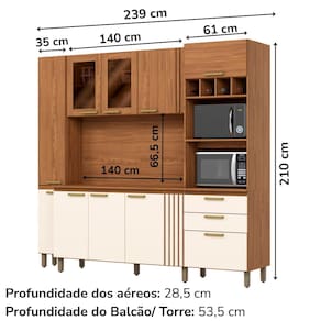 Cozinha Completa BE383, uma proposta pensada para tornar a cozinha mais organizada e agradável no uso diário. Estrutura em MDP de 15 mm (fundo MDF de 3 mm) e pintura UV texturizada. Conta com 10 portas com dobradiças metálicas, sendo 1 porta basculante com pistão a gás e 2 portas de vidros. Torre quente com espaço para 2 forno ou microondas: 1- A: 35,7 x L: 58 x P: 51,5 cm | 2- A: 35,3 x L: 58 x P: 51,5 cm, 2 gavetas com corrediças telescopicas e prateleiras internas, detalhe com aplique ripado em alto relevo. Possui também puxadores em ABS, pés em ABS com regulagem de altura (14,5 cm) e tampo em MDP de 15 mm, com painel de fundo em MDP 12 mm. Produtos serão entregues em 05 volumes.