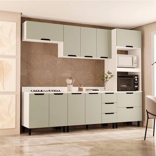 Cozinha Completa com Tampo Meena 10 Portas 4 Gavetas Verde e Branca