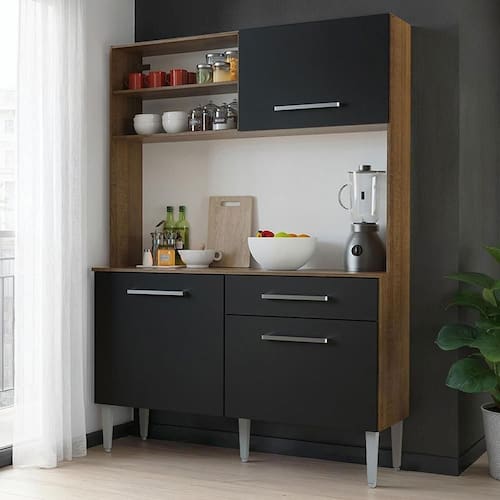 Perfeita em apartamentos e casas que precisam de total otimização do espaço, a cozinha é composta por materiais de ótima qualidade, como puxadores com alumínio, corrediças e dobradiças metálicas e pés em PVC. Além disso, o espaço é ideal para organizar todos os utensílios, como panelas, eletroportáteis e muito mais. Para completar, apresenta um acabamento que combina as tonalidades amadeirado Rustic e preto.