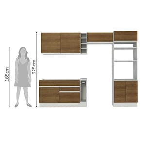 - O acabamento de toda a cozinha é branco, com exceção das portas que são no padrão amadeirado Rustic.