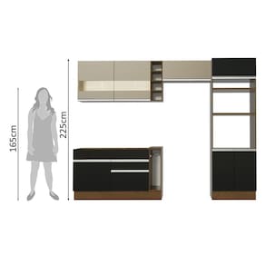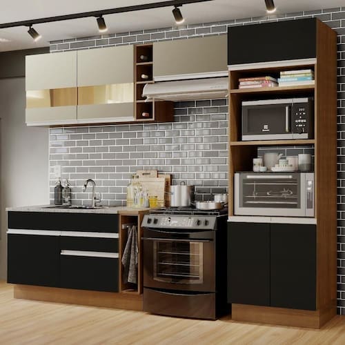 - Itens inclusos: Um balcão de pia com duas gavetas e uma porta (não acompanha tampo) | Um balcão porta panos com tampo de MDP em pintura amadeirado Rustic | Um aéreo com duas portas com detalhe em vidro Reflex | Uma adega | Um aéreo com uma porta basculante | Uma torre quente com dois nichos para forno e micro-ondas, um nicho menor e três portas, sendo uma basculante;