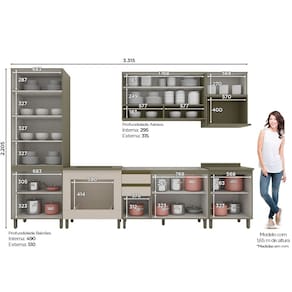 Composicao do Kit -A x L x P-:1 Cristaleira 04 Portas 220,5 x 71,5 x 51,5 Cm;1 Aereo 01 Porta Basc. 67,5 x 120 x 32 Cm; 1 Aereo 01 Porta Basc. 34 x 60 x 31,5 Cm; 1 Aereo Micro-ondas 44 x 60 x 47,5 Cm;1 Balcao Forno Embutir 82 x 80 x 51 Cm; 1 Balcao Pia 02 82 x 120 x 51 Cm; 1 Balcao 02 Portas 82 x 60 x 51 Cm; 1 Tampo 2,5 x 60 x 53,5 Cm; 1 Tampo p/Cooktop 2,5 x 80 x 53,5 Cm;