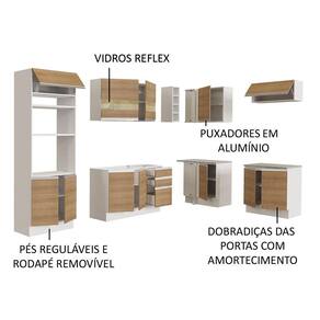 O acabamento da estrutura é branco e as portas e frentes são no padrão amadeirado Rustic. É feito em Pintura Poliéster com 7 camadas que protegem o móvel dos efeitos do álcool da água e do calor.