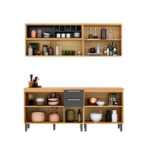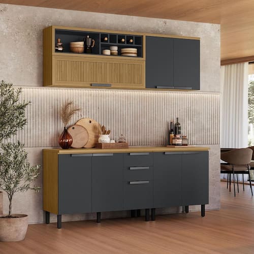 O conjunto de cozinha New Porto da Itatiaia combina modernidade, funcionalidade e acabamento de alto padrão em uma solução completa para seu ambiente. Com 200cm de largura, esse conjunto é composto por dois módulos inferiores (balcões) e dois armários aéreos, oferecendo excelente aproveitamento de espaço e um visual sofisticado. Produzido 100% em MDF, conta com acabamento grafite e detalhes amadeirados, além de pintura eletrostática UV que garante resistência e uniformidade. Os balcões incluem: 1 balcão de 120cm com 3 portas e 2 gavetas 1 balcão de 80cm com 2 portas Já os armários aéreos são: 1 aéreo de 120cm com 1 porta horizontal, nichos e garrafeiro embutido 1 aéreo de 80cm com 2 portas Todos os módulos contam com pés reguláveis, puxadores modernos e excelente capacidade interna. As gavetas possuem corrediças metálicas que garantem praticidade no uso diário, e os nichos abertos nos armários aéreos proporcionam um toque decorativo e funcional. Ideal para quem busca sofisticação e organização sem abrir mão da qualidade e do design contemporâneo.