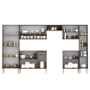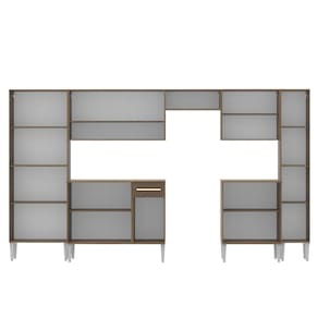 - Ela é dividida em seis módulos independentes: paneleiro duplo com quatro portas; balcão de pia; armário aéreo com duas portas e dois nichos; balcão de duas portas; armário aéreo de duas portas; paneleiro com duas portas.