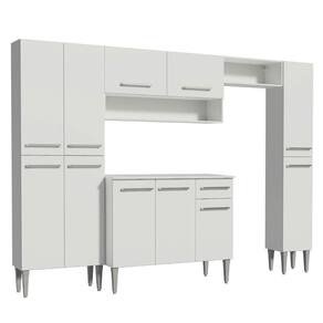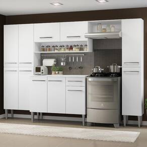 - Itens inclusos: Um (1) Paneleiro duplo com quatro portas; Um (1) Balcão com três portas, uma gaveta e tampo; Um (1) Aéreo com duas portas e dois nichos; Um (1) Paneleiro com duas portas