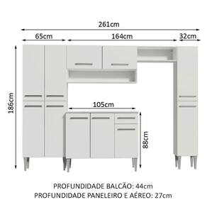 - Medidas totais da cozinha: 186 cm de altura e 261 cm de largura. Profundidade de 44 cm nos balcões e 27 cm nos paneleiros e aéreos.
