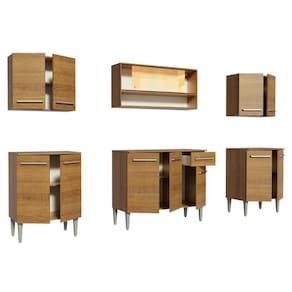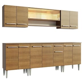 - Itens inclusos: Dois Armários aéreos com duas portas | Um Armário aéreo com duas portas de correr de vidro reflex e um nicho | Um Balcão com três portas, uma gaveta e tampo | Dois Balcões com duas portas e tampo