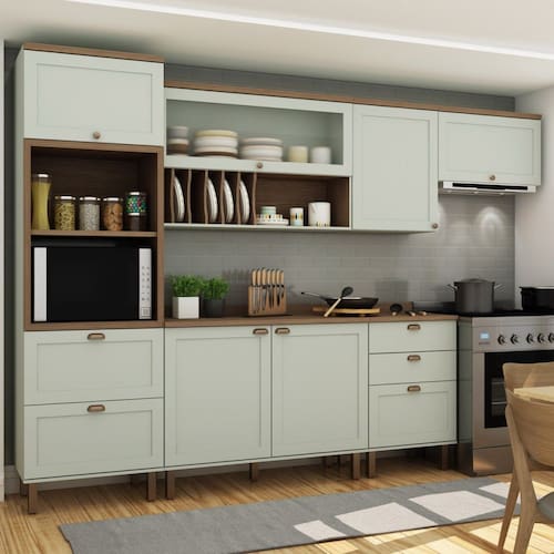 O(a) Cozinha Completa Filadélfia 7 Portas 4 Gavetas Menta - Loja é produzido em MDF na escala de brilho Fosco, e possui um grau de dificuldade de montagem: Médio.