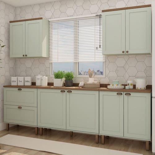 O(a) Cozinha Completa Filadélfia 9 Portas 1 Gaveta Menta - Loja é produzido em MDF na escala de brilho Fosco, e possui um grau de dificuldade de montagem: Médio.