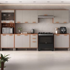 Composta por módulos amplos e bem distribuídos, a cozinha oferece ótimo aproveitamento interno, puxadores em ABS resistentes, pés reguláveis e dobradiças que facilitam o uso no dia a dia.