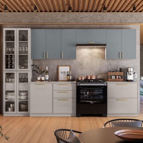 Com um visual moderno e elegante, esta cozinha se destaca pela sua versatilidade e funcionalidade. Ideal para quem busca um ambiente sofisticado e bem organizado.