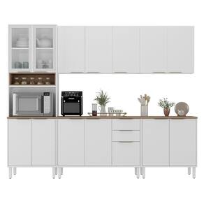 Composta por 5 peças, a cozinha inclui duas portas de vidro, que trazem leveza e sofisticação ao ambiente, além de facilitar a visualização dos itens armazenados. O paneleiro conta com um espaço dedicado especialmente para o forno, otimizando o uso do espaço e proporcionando uma solução inteligente para quem deseja mais funcionalidade.