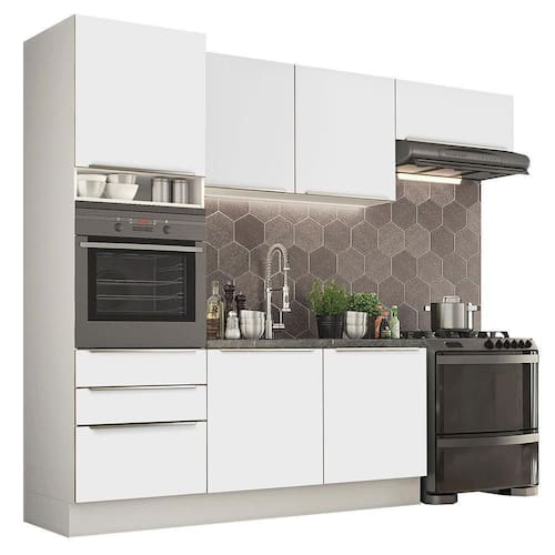 O acabamento da estrutura é branco e as portas e frentes das gavetas são em Branco Veludo. É feito em Pintura Poliéster, que consiste na aplicação de 7 camadas que protegem o móvel dos efeitos do álcool da água e do calor.