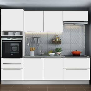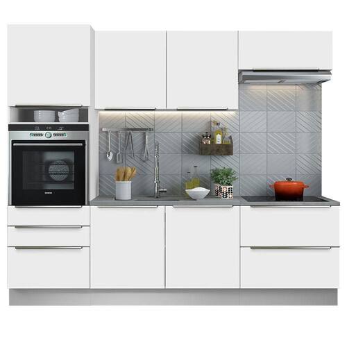 A profundidade é de 60 cm nos módulos inferiores e 31 cm nos aéreos. O balcão maior comporta pias de 120 cm x 60 cm e não acompanha tampo. Além disso, a torre permite a instalação de forno embutido.