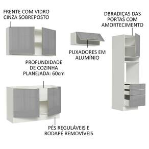 Um dos grandes destaques são as portas e gavetas, que recebem um vidro cinza aplicado, detalhe que traz muita elegância ao ambiente.