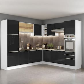 A linha de cozinhas Lux da Madesa se destaca por suas portas e gavetas, que recebem um vidro preto aplicado, detalhe que traz muita elegância ao ambiente. Nesta versão de canto, é ideal para ambientes grandes e que possuem muito espaço disponível.