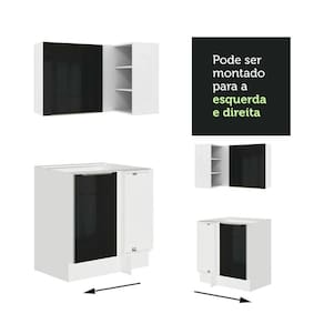 O acabamento da estrutura é branco e as portas e frentes das gavetas são pretas. É feito em Pintura Poliéster, que consiste na aplicação de 7 camadas que protegem o móvel dos efeitos do álcool da água e do calor.