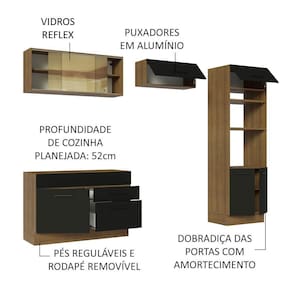O acabamento da estrutura é no padrão amadeirado Rustic e as portas e frentes são pretas. É feito em Pintura Poliéster ecológica, com aplicação de 7 camadas de proteção resistentes a álcool, água e calor.