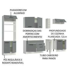 Os materiais utilizados na fabricação são de alta qualidade, como gavetas com corrediças telescópicas e portas com amortecedor para fechamento suave. Já os puxadores possuem alças metálicas, mais resistentes ao uso diário.