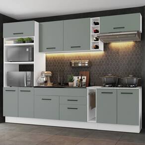 Esta versão é super completa e conta com torre-quente com espaço para forno e micro-ondas, além de adega e balcão porta-pano. O balcão de pia no tamanho de 120 x 52 cm suporta pias de inox e pedra e o balcão de 80 cm acompanha tampo, que pode ser recortado para colocação de cooktop.