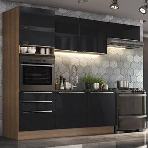 A linha de cozinhas Lux da Madesa é o que existe de mais sofisticado no mercado. O grande destaque são as portas e gavetas que recebem um vidro preto aplicado, detalhe que traz muita elegância ao ambiente.