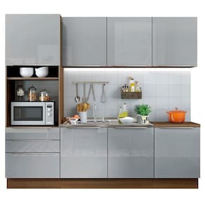 As medidas totais da cozinha são: 240 cm de largura x 225 cm de altura. A profundidade é de 60 cm nos módulos inferiores e 31 cm nos aéreos. O balcão comporta pias de 120 cm x 60 cm. Não acompanha tampo.