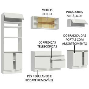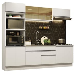 O acabamento da cozinha é branco, feito em Pintura Poliéster com 7 camadas que protegem o móvel dos efeitos do álcool da água e do calor.