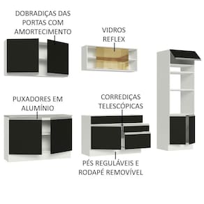O acabamento da estrutura é branco e as portas e frentes são pretas. É feito em Pintura Poliéster ecológica com sete camadas, que destaca a tonalidade e protege o móvel.