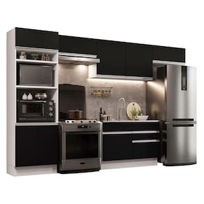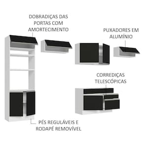 O acabamento da estrutura é branco e as portas e frentes são pretas. É feito em Pintura Poliéster ecológica com sete camadas, que destaca a tonalidade e protege o móvel.