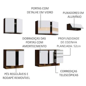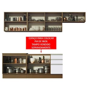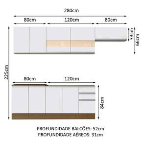 Outro grande diferencial desta cozinha é a profundidade maior, como uma cozinha planejada: 52 cm nos balcões inferiores e 31 cm nos aéreos. As medidas totais da Cozinha Madesa Marcela são: 280 cm de largura e 225 cm de altura.