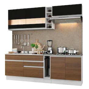 O acabamento da estrutura interna e externa é branco. As portas dos aéreos são pretas e as portas dos balcões e frentes das gavetas são em amadeirado Rustic. Os processos são feitos em Poliéster Protetor ecológico de alta resistência, que protege o móvel dos efeitos da água, do álcool e do calor.