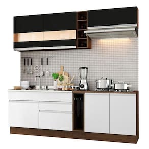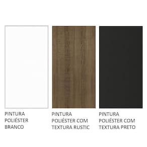 O acabamento da estrutura interna e externa é no padrão amadeirado Rustic. As portas dos aéreos são pretas. As portas dos balcões, as gavetas e as costas são brancas. Os processos são feitos em Poliéster Protetor ecológico de alta resistência, que protege o móvel dos efeitos da água, do álcool e do calor.
