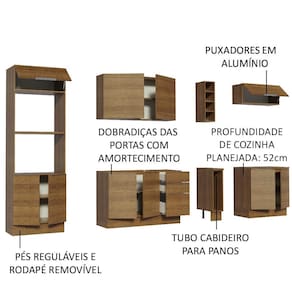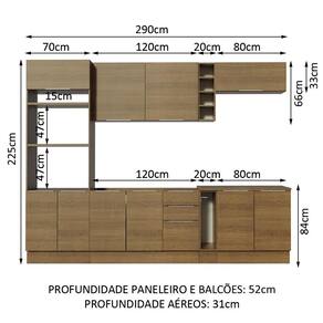 As medidas totais são: 290 cm de largura e 225 cm de altura. Profundidade de 52 cm nos balcões na torre e 31 cm nos aéreos.