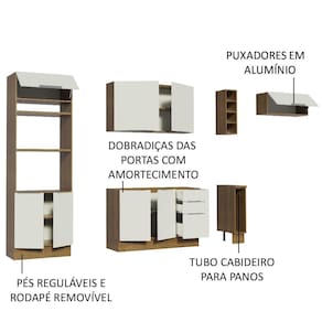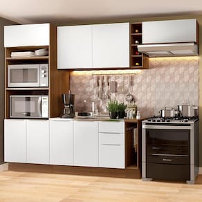 Tem espaço pra tudo neste modelo: forno, micro-ondas, garrafas, louças, eletros, panos e o que mais você imaginar. É a escolha perfeita para deixar a cozinha muito mais organizada e funcional.