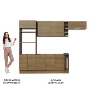 A profundidade é de cozinha planejada: 52 cm nos balcões e na torre e 31 cm nos aéreos. As medidas totais são: 290 cm de largura e 225 cm de altura.
