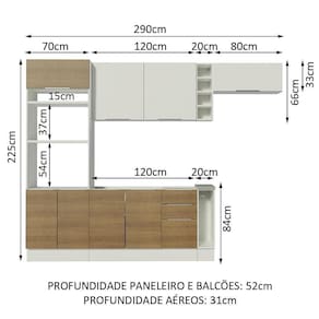 A profundidade é de cozinha planejada: 52 cm nos balcões e na torre e 31 cm nos aéreos. As medidas totais são: 290 cm de largura e 225 cm de altura.