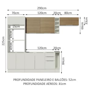 A profundidade é de cozinha planejada: 52 cm nos balcões e na torre e 31 cm nos aéreos. As medidas totais são: 290 cm de largura e 225 cm de altura.