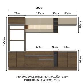 Outro grande diferencial desta cozinha é a profundidade maior, como uma cozinha planejada: 52 cm no balcão inferior e 31 cm nos aéreos. As medidas totais são: 290 cm de largura e 225 cm de altura.