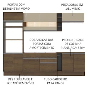Possui também pés reguláveis e rodapé removível. Para completar, os aéreos em pintura Crema com detalhe em vidro reflex conferem muita elegância ao ambiente.