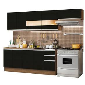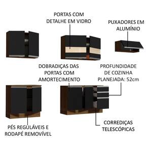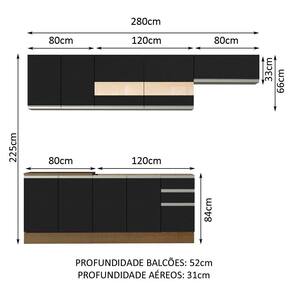 Outro grande diferencial desta cozinha é a profundidade maior, como uma cozinha planejada: 52 cm nos balcões inferiores e 31 cm nos aéreos. As medidas totais da Cozinha Madesa Marcela são: 280 cm de largura e 225 cm de altura.