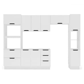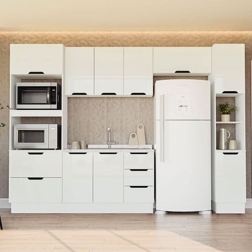 O(a) Cozinha Completa Meena 10 Portas 4 Gavetas 40250062 Branco - Politorno é produzido em MDF e MDP na escala de brilho Semi-Fosco, e possui um grau de dificuldade de montagem: Médio.
