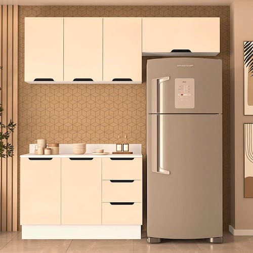 O(a) Cozinha Completa Meena 6 Portas 3 Gavetas 40250069 Branco/Creme - Politorno é produzido em MDF e MDP na escala de brilho Semi-Fosco, e possui um grau de dificuldade de montagem: Médio.