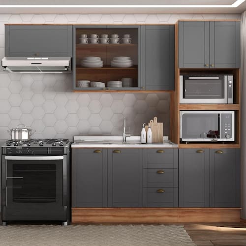 A Cozinha Bella Daisy foi feita para trazer praticidade e funcionalidade ao seu dia a dia. Esta composição foi desenvolvida pensando em atender às necessidades de todos usuários, unindo praticidade com estilo. Seu design inspirado nas cozinhas clássicas estilo americano possui detalhes usinados nas frentes, deixando qualquer ambiente mais bonito. Com acabamento em MDF e BP, dobradiças com amortecimento e puxadores metálicos em formato ponto e concha, na cor ouro velho, proporciona um acabamento de alta qualidade.