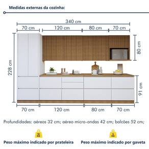 É uma cozinha resistente? Sim, o material MDF de alta qualidade garante resistência e durabilidade. Acabamento da Prateleira: Pintura Escala de Brilho da Prateleira: Fosco Acabamento da Gaveta: Impressão Escala de Brilho da Gaveta: Fosco Acabamento da Porta: Impressão Escala de Brilho da Porta: Fosco Acabamento dos Pés: Pintura Acompanha Tampo: Sim Altura dos Pés: 10 cm Altura Máxima dos Pés: 10.0000 Ambiente Principal: Cozinha Balcão Suporta Pia: Não codigo_ean: 7900288202437 Complexidade da Montagem: Alta: deve ser montado por um montador especializado Cor: Branco/Marrom Cor do Produto: Branco/Marrom Escala de Brilho: Fosco Espessura do Tampo: 30 mm Gaveta com Chave: Não Itens Inclusos: 1 Cozinha Completa, Kit Ferragens e Manual de Montagem Linha ou Coleção: Norten Manual de Montagem e Instalação: https://product-hub-prd.madeiramadeira.com.br/306490790/documents/f4607b16-5418-4f2e-bf85-ea8c99a6fcf6309331673217533575929624.pdf Marca: Nesher Móveis Material da Corrediça: Metálica Material da Dobradiça/Corrediça da Porta: Metálica Material da Gaveta: MDF Material da Porta: MDF Material da Prateleira: MDF Material do Tampo: MDF Material dos Pés: MDF Medida de cada item (A x L x P): Paneleiro 2 Portas 2 Gavetas 70 Cm A: 228 Cm P: 52 Cm L: 70 Cm Arm. Micro-ondas 1 Porta Basc. 70 Cm A: 80 Cm P: 42 Cm L: 70 Cm Armário Aéreo 2 Portas 120 Cm A: 80 Cm P: 32 Cm L: 120 Cm Balcão 1 Porta 4 Gavetas 120 Cm A: 91 Cm P: 52 Cm L: 120 Cm Balcão 1 Porta 1 Gaveta 80 Cm A: 91 Cm P: 52 Cm L: 80 Cm Balcão 1 Porta 1 Gaveta 70 Cm A: 91 Cm P: 52 Cm L: 70 Cm Armário Aéreo 2 Portas 80cm A: 80 Cm P: 32 Cm L: 80 Cm Balcão 1 Porta 4 Gavetas 120 Cm A: 91 Cm P: 52 Cm L: 120 Cm Balcão 1 Porta 1 Gaveta 80 Cm A: 91 Cm P: 52 Cm L: 80 Cm Painel De Ilhacanelado 200 Cma: 100 Cmp: 35,5 Cml: 200 Cm modular: Sim Necessita Montagem: Sim O Balcão Acompanha Pia: Não Origem do Produto: Nacional Pés Reguláveis: Não Peso: 476,76 kg Peso Máximo por Gaveta: 5 kg Peso Máximo por Prateleira: 10 kg Possui Pés: Rodapé Possui Portas: Sim Possui Prateleiras: Sim Possui recorte para Cooktop: Não Possui Rodízio: Não Possui Vidro: Não Produto Montado: Sim Recomendações de Uso, Manutenção e Limpeza: Utilizar pano macio levemente umedecido e na sequencia pano macio seco. Sapatas Niveladoras: Não Sistema de Montagem: Parafusos. Tamanho Indicado da Pia: . Tipo de Corrediça da Gaveta: Metálica Telescópica Tipo de Dobradiça da Porta: 35 mm Tipo de Dobradiça/Corrediça da Porta: 35 mm Tipo de Puxador da Gaveta: Embutido Tipo de Puxador da Porta: Embutido Marca: Não Informado