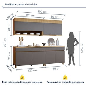 Pode ser utilizado em outro ambiente? Claro, com criatividade, ele pode ser utilizado em vários ambientes. Acabamento da Prateleira: Impressão Escala de Brilho da Prateleira: Semi-Brilho Acabamento da Gaveta: Impressão Escala de Brilho da Gaveta: Semi-Brilho Acabamento da Porta: Impressão Escala de Brilho da Porta: Semi-Brilho Material do Puxador da Porta: Alumínio Acabamento dos Pés: Pintura Acompanha Tampo: Sim Altura dos Pés: 10 cm Altura Máxima dos Pés: 10.0000 Ambiente Principal: Cozinha Balcão Suporta Pia: Não codigo_ean: 7900288293251 Complexidade da Montagem: Alta: deve ser montado por um montador especializado Cor: Carvalho/Titânio Cor do Produto: Carvalho/Titânio Escala de Brilho: Semi-Brilho Espessura do Tampo: 25 mm Gaveta com Chave: Não Itens Inclusos: 1 Cozinha Completa, Kit Ferragens e Manual de Montagem Linha ou Coleção: Realeza Premium Manual de Montagem e Instalação: https://product-hub-prd.madeiramadeira.com.br/720337950/documents/462cf7da-7688-42f5-9ba7-c9c590fc3a7f334131473217655413871696.pdf Marca: Nesher Móveis Material da Corrediça: Metálica Material da Dobradiça/Corrediça da Porta: Metálica Material da Gaveta: MDF Material da Porta: MDF Material da Prateleira: MDF Material do Tampo: MDF Material dos Pés: ABS Medida de cada item (A x L x P): Aéreo 2 portas: 78x80x32;aéreo 1 porta: 78x120x32;Balcão 1 gaveta: 91x80x45;balcao 2 gavetas: 91x120x45. modular: Sim Necessita Montagem: Sim O Balcão Acompanha Pia: Não Origem do Produto: Nacional Pés Reguláveis: Sim Peso: 126,26 kg Peso Máximo por Gaveta: 5 kg Peso Máximo por Prateleira: 15 kg Possui Pés: 09 Possui Portas: Sim Possui Prateleiras: Sim Possui recorte para Cooktop: Não Possui Rodízio: Não Possui Vidro: Não Produto Montado: Sim Recomendações de Uso, Manutenção e Limpeza: Utilizar pano macio levemente umedecido e na sequencia pano macio seco Sapatas Niveladoras: Sim Sistema de Montagem: Parafusos e Cavilhas Tipo de Corrediça da Gaveta: Metálica Telescópica Tipo de Dobradiça da Porta: 35 mm Tipo de Puxador da Gaveta: Embutido Tipo de Puxador da Porta: Externo Marca: Não Informado